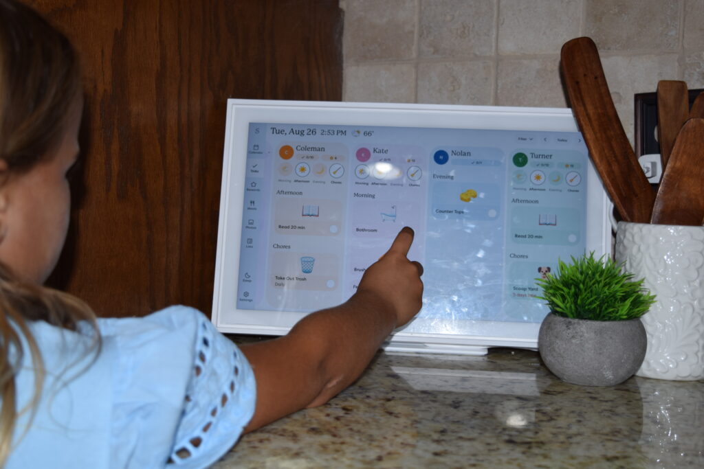 I keep this organized with our Skylight Family Calendar. The kids love checking things off their lists and seeing the tiny confetti celebrations they earn when they do. It takes a lot of work to remind them and manage it daily off my shoulders, too.